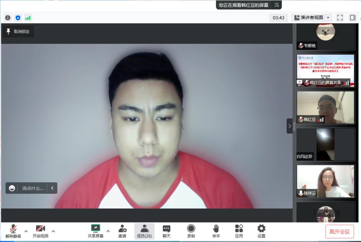 与会师生集体观看习近平总书记在新疆考察调研的视频。团队指导教师代表、地理科学本科生第二党支部书记韩红豆,团队成员、教育部第五届大学生就业创业人物事迹入选者、校第18届“师大骄子”十佳大学生标兵、2020级地理科学(师范)专业预备党员阿卜来提·阿卜力克木,相继领学了习近平总书记在新疆考察时的重要讲话精神。阿卜来提·阿卜力克木表示,“总书记的重要讲话让我深刻认识到,民族团结是我国各民族人民的生命线,新疆各民族都是中华民族大家庭不可分割的成员,我们一定会牢记总书记殷切期望,脚踏实地、踔厉奋发,争做为中国特色社会主义、为中华民族努力奋斗的一代青年。”