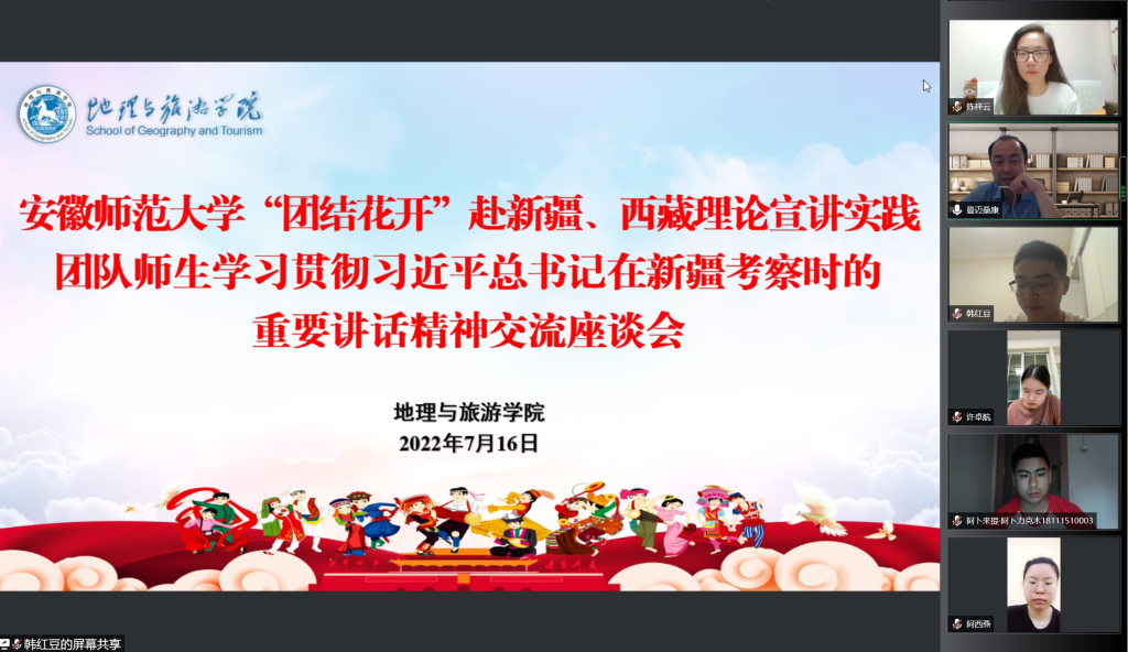 7月12日至15日,中共中央总书记、国家主席、中央军委主席习近平在新疆考察。7月16日,地旅学院积极行动,组织该院国家级暑期社会实践重点团队——安徽师范大学“团结花开”边疆少数民族学子赴新疆、西藏理论宣讲实践团队的师生,通过线上开展学习贯彻习近平总书记在新疆考察时的重要讲话精神交流座谈会,地旅学院党委副书记乔静、团委书记陈祥云、团队指导教师代表以及全体队员参会,会议由陈祥云主持。