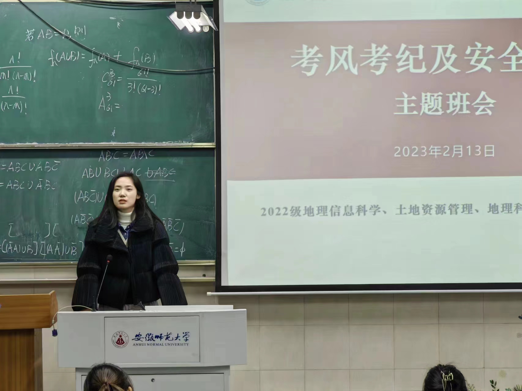 本网讯(地旅学院 魏语菲、陈祥云)2月13日晚,2022级地理信息科学、地理科学(拔尖人才班)、土地资源管理分别于教学楼4号楼201、202、302教室举行考风考纪教育主题班会,会议由辅导员陈祥云主持,全体180名同学参与此次会议。